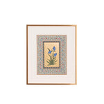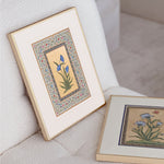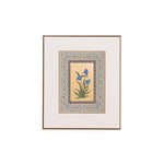 Three delicate sapphire blooms rise gracefully, their petals whispering secrets of the sky. Each leaf, painted with care, dances softly in a frame adorned with intricate floral patterns. This artwork captures the serene beauty of nature, frozen in a moment of timeless elegance.Invite this poetic masterpiece into your home, where its gentle charm and tranquil presence will create a haven of peace and sophistication. Let it grace your walls, a subtle reminder of nature's delicate artistry and the quiet beauty that surrounds us.